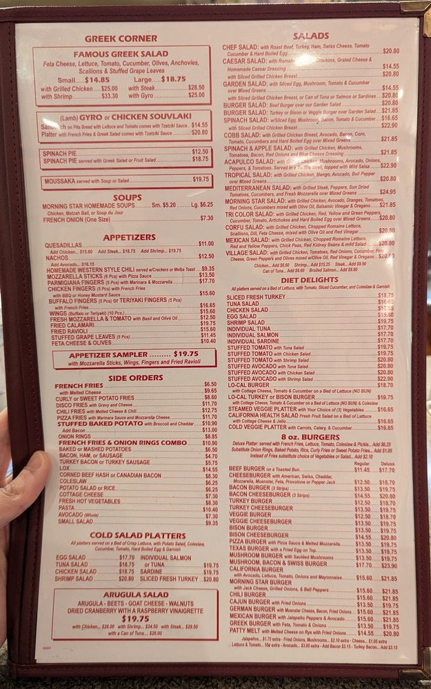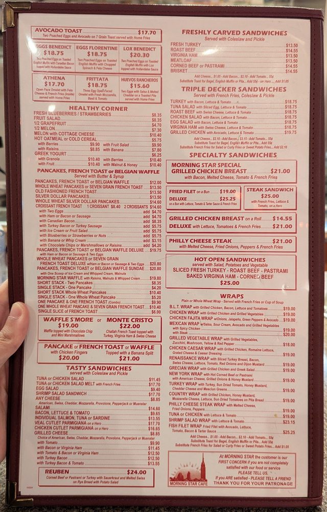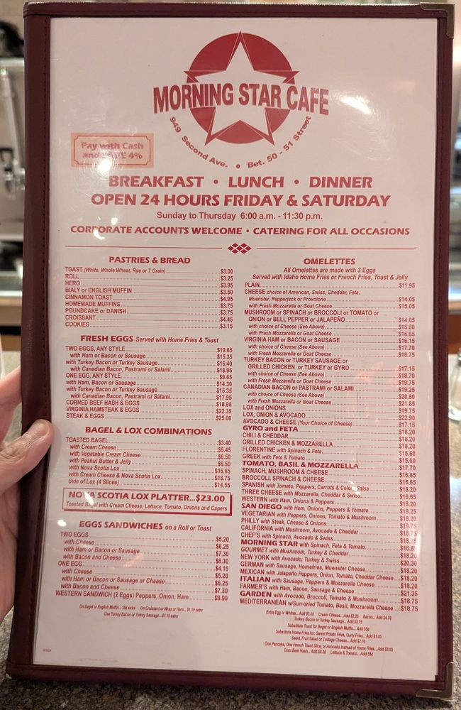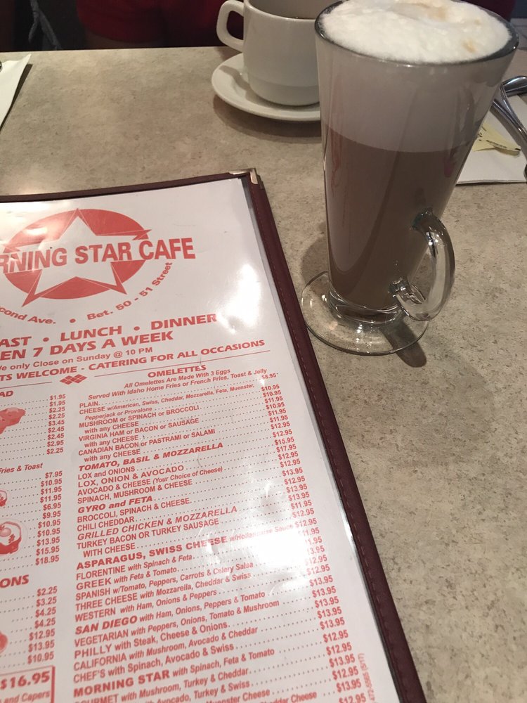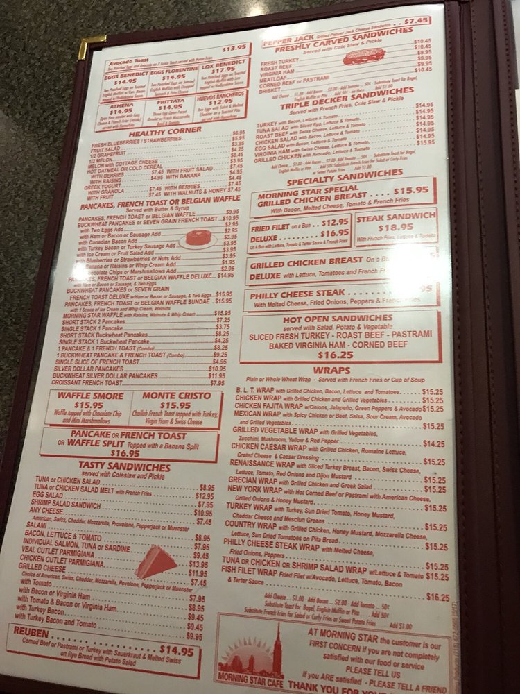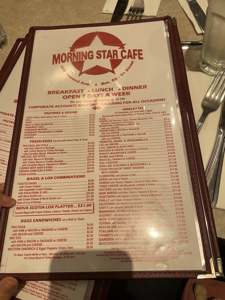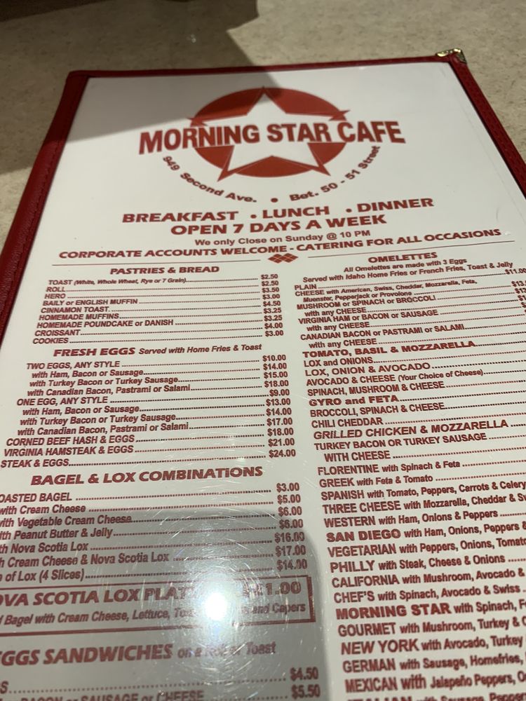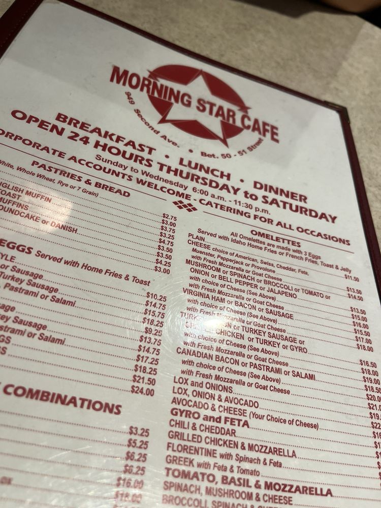 Morning Star Cafe is a cozy diner located in New York City, offering a variety of breakfast options that cater to both meat-eaters and vegans. The cafe provides a casual atmosphere perfect for groups and families, with the option for takeout or delivery. Their menu includes traditional favorites like eggs cooked to your liking, bagel and lox combinations, and a selection of pastries and bread. Customers have praised the prompt service, good prices, and plentiful selection at this cafe. With positive reviews from satisfied patrons, Morning Star Cafe stands out as a great spot for a quick and delicious breakfast or brunch in the bustling city.
